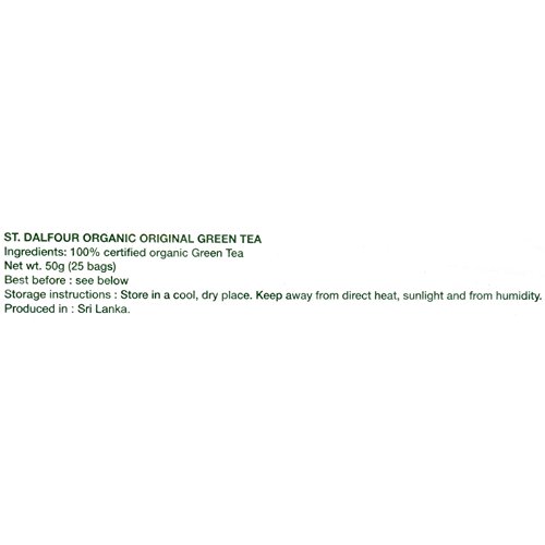 Studio : St Dalfour Publisher : St Dalfour Binding : Misc. Product Description St. Dalfour Organic Green Tea Original Description: Certified Organic Green Tea Selected and Blended Under the Direction of the Tea Experts of St. Dalfour France Individually Sealed in Envelopes The St. Dalfour tea experts have searched the best tea producing areas in the world. After careful screening, they have selected special pristine tea gardens, No preservatives or chemicals are used. In these gardens master planters nurture tea bushes with natural organic biomass and loving care. Only these tea gardens are used for St. Dalfour Green Tea. Since tea is made directly from tea leaves plucked on a continuous basis during harvest (and these tea leaves are not washed), it is vitally important to make certain these leaves are free of any chemicals. Be confident of having pure, wholesome tea when buying St. Dalfour; the finest tea in the world. St. Dalfour Organic Tea -- Healthy Packaging Each tea bag is individually sealed in an envelope to preserve its fresh, natural flavor. The tea bags are made with eco-friendly paper. No chemicals (which would alter the taste of the tea) touch the tea bag. The tea bag is attached to the tag by a pure, sanitized string without the use of metal staples. Thus, no metallic taste is found in the tea. The tea is packaged in an air controlled, immaculate chamber which prevents any impurities from affecting the taste of the tea. Free Of Chemicals and metal staples. Disclaimer These statements have not been evaluated by the FDA. These products are not intended to diagnose, treat, cure, or prevent any disease. Ingredients : 100% organic green tea. Organic : Yes Size : 25 BAG Pack of : 6