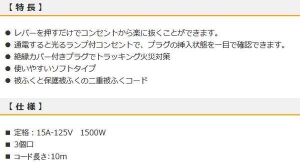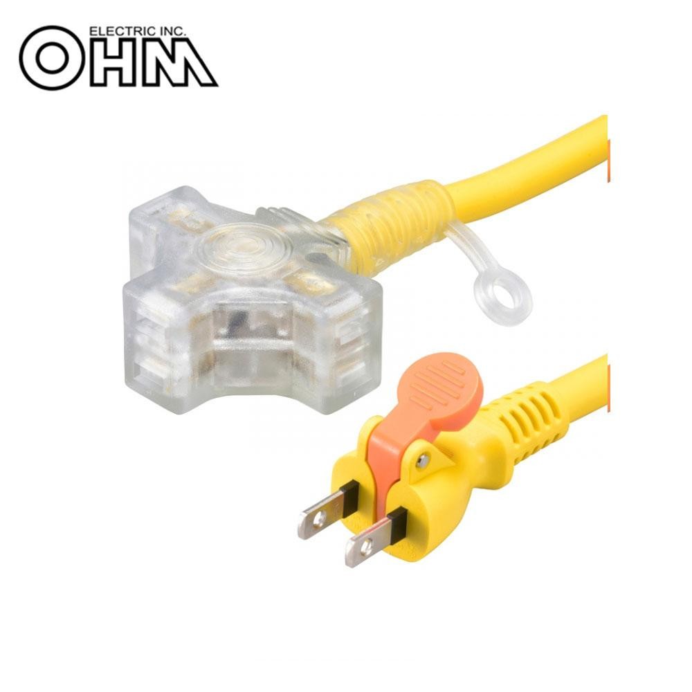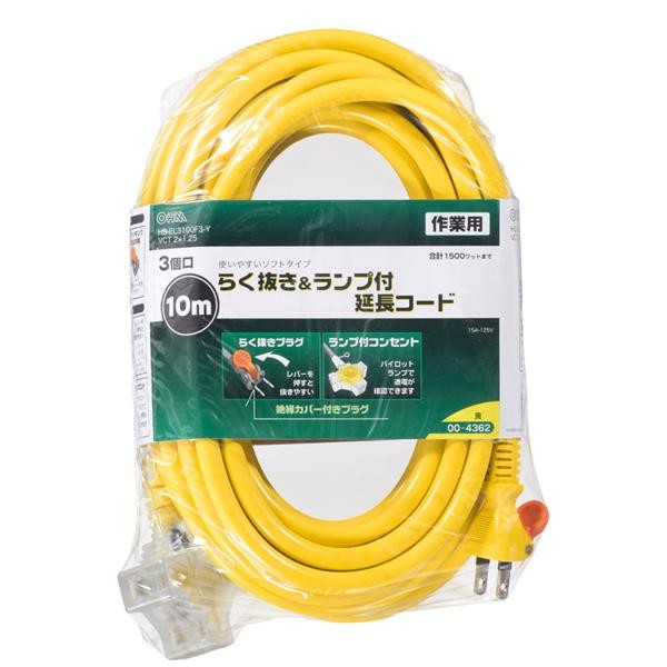 レバーを押すだけでコンセントから楽に抜くことができます。通電すると光るランプ付コンセントで、プラグの挿入状態を一目で確認できます。 製造国:中国 ※サプライヤー直送品 ご注文後2~3営業日後の出荷となります【商品名】OHM らく抜き&通電ランプ付 作業用延長コード 3個口 10m 黄 HS-EL3100F3-Y