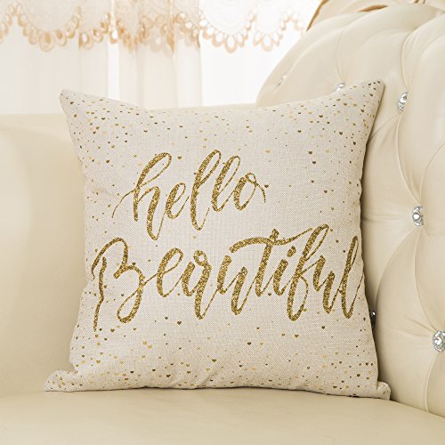 Fjfz Hello Beautiful Motivational Sign Inspirational Quote Cotton Linen Home Decorative Throw Pillow Case Cushion Cover for Sofa Couch, Gold Glitter, 18" x 18"