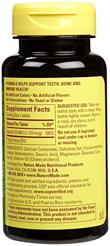 -. Binding : Health and Beauty -. Brand : Nature Made -. Feature : Promotes the strength of your immune system / Supports bone and joint health / No artificial flavors -. Label : Nature Made -. Manufacturer : Nature Made -. MPN : 1688 -. PartNumber : 1688 -. ProductGroup : Health and Beauty -. ProductTypeName : HEALTH_PERSONAL_CARE -. Publisher : Nature Made -. Studio : Nature Made -. Title : Nature Made Vitamin D 400 IU 100 Count Tablets
