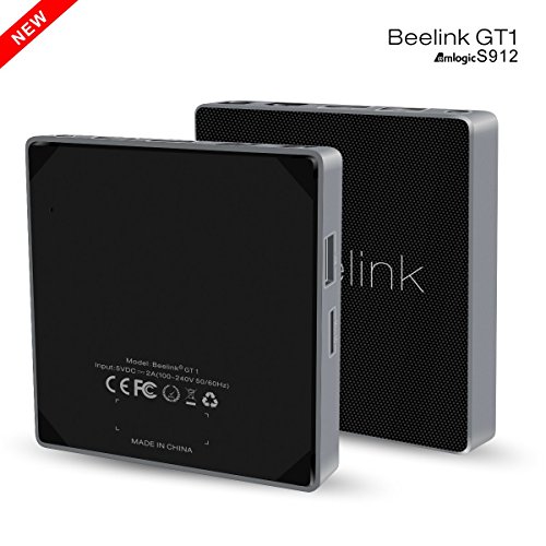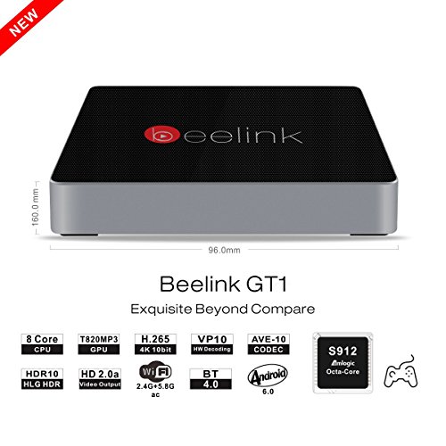 -. Binding : Electronics -. Brand : Beelink -. Color : Clear -. EAN : 0611138217200 -. Feature : Powerful 4K Media Player.Support 4k 60Hz HD2.0a CVBS output.Maximum support HEVC 4k 10 bit 60 Hz.KODI support:Dolby/dts audio decoding. / p4K HDR with HD2.0a image enhancement processing.Color,Saturation Clear and prominent. / Gigabit Ethernet:Beelink GT1 to 10/100/1000 Ethernet Jack.Faster data transfer and Internet browsing Web sites faster. / Utilizes the latest version eMMC memory which users can enjoy faster read&write speed.Safe and reliable,Data stable/Date is not lost.Faster read and write. / Beelink GT1 streams your video/music/photo from your Android devices/iOS devices through DLNA/Airplay/Miracast, and allows users to screen cast through Beelink GT1 onto big screen.Enjoy the best gaming&entertainment experience. -. IsAdultProduct : 0 -. IsEligibleForTradeIn : 1 -. Label : Beelink -. Manufacturer : Beelink -. Model : GT1 -. MPN : GT1 -. PackageQuantity : 1 -. PartNumber : GT1 -. ProductGroup : Home Theater -. ProductTypeName : CAMERA_OTHER_ACCESSORIES -. Publisher : Beelink -. Studio : Beelink -. Title : Beelink GT1 Smart TV Box Amlogic S912 Octa Core ARM Cortex-A53 Android 6.0 ARM Mali-T820MP3 GPU up to 750MHz(DVFS) RAM DDR3 2GB ROM Onboard eMMC Flash 16GB 1000Mbps LAN BT 4.0 Streaming Media Players -. UPC : 611138217200