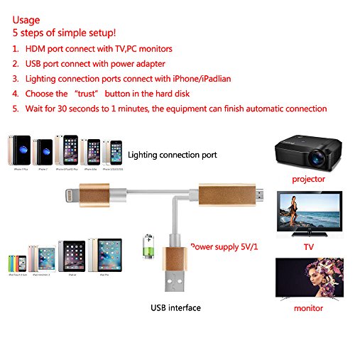 - 【Small Screen to Large Screen】By applying this Lightning to HDMI Adapter Cable, you could easy to upload and mirror what is displaying on your iPhone device to a large device screen like HDTV, Projector and Computer. Simply attach the Lightning Digital AV Cable to the Lightning connector on your device and then to your TV or projector.