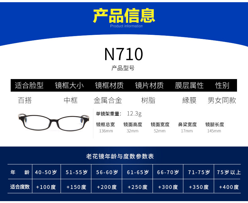 Male models: the total width of the frame 136mm, mirror height 32mm, mirror width 52mm, the bridge of the nose width of 17mm, temple length 145mm