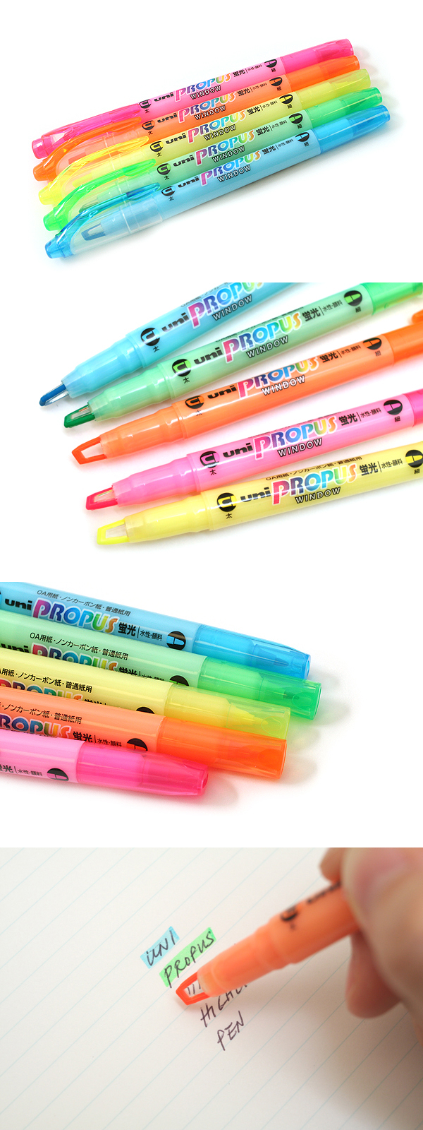 바로 형광펜 팁에 달린 쏘~쿨한 투명 윈도우다. 이 곳을 통해 내가 하이라이트한 곳을 볼 수 있도록 고안되었다. 펜 끝에 문자가 가려져버려서 필요없는 부분까지 라인을 그어버리는 일이 종종 있었지만, 프로퍼스 윈도우 형광펜으로는 펜 끝에 달려있는 창으로 문자를 볼 수 있어서 체크하고 싶은 곳까지만 정확하게 하이라이트 할 수 있다. 게다가 넓은 4.0mm팁과 가는 0.6mm팁이 하나의 펜에 들어있는 콤보 형광펜이다!