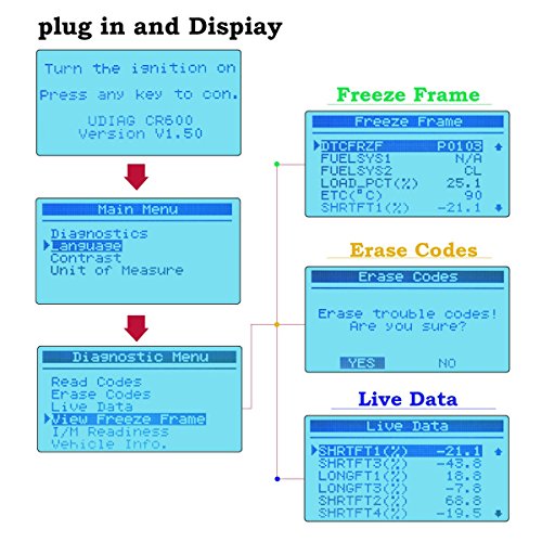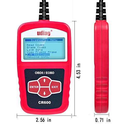 - NO BATTERY NEEDED: CR600 obd ii scanner is well built with a large LCD display (128 x 64 pixel) that has white backlight and contrast adjustment, indicates test results directly. CR600 Built-in OBD2 DTC lookup library. No batteries needed-powered via detachable OBDII cable, Safely communicates with the on-board computer.