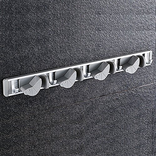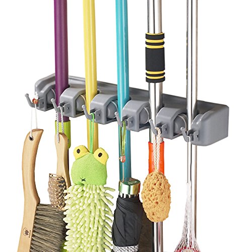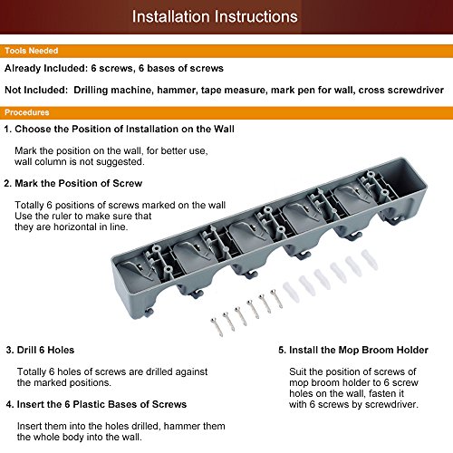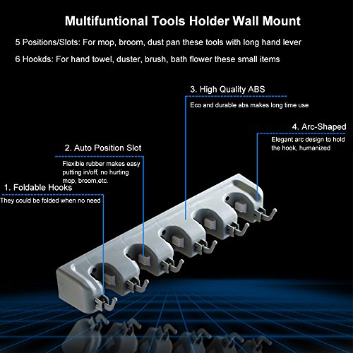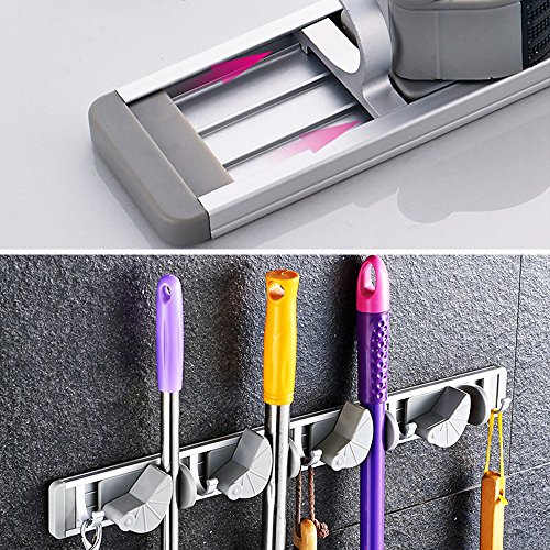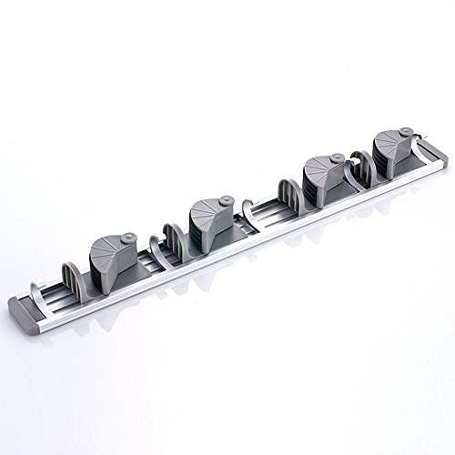 -. Feature : ?4 Slots 5 Hooks?Totally 4 pieces mop, broom, duster pan, shovel, rake these long handle lever cleaning tools could be hold together, 5 hooks for small ones like umbrella, brush, bath ball, the mop holder wall mounted keeps them well-organized on the wall. / ?Space Aluminum, Light, Size?It´s a mop holder metal made of high quality space aluminium, not easy to rust, durable. Light weight only 0.62lb, 19.68*1.97*1.57 inch. / ?Adjust Position?The position of slot on this broom holder metal could be adjusted left/right to better the needs of different size mop, broom, etc. / ?Multi Conditions, Easy Installing?It´s a mop holder organizer which could be used at bathroom, balcony, laundry, garden, garage, tool room, etc. Only if the wall could be hole drilled. Just take a few minutes to install. / ?Warranty? We offer 12 Months warranty and customer service before& after sale for this mop and broom holder.