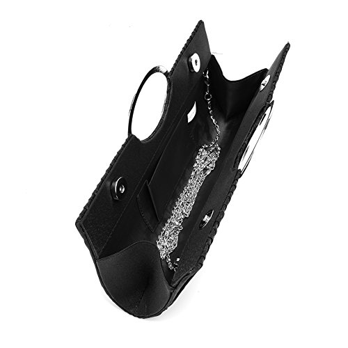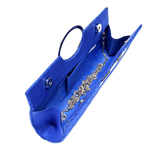 -. Feature : Luxury Satin Material with Rhinestones in middle of the bag make you attractive in the night / Dimensions: 11.02" x 1.96" x 4.72",Detachable chain strap: 47.2 inch (120 CM) / Carrying options: Can be held in hand as a clutch, or slipped over the shoulder using the detachable chain strap. / Capacity: It's a very cute little bag that fit everything I needed (cell phone, lipstick, a few bobby pins, ID, debit card, cash). / Occasion: Great for wedding, party, prom, and etc. Just get this bag to have a wonderful night.