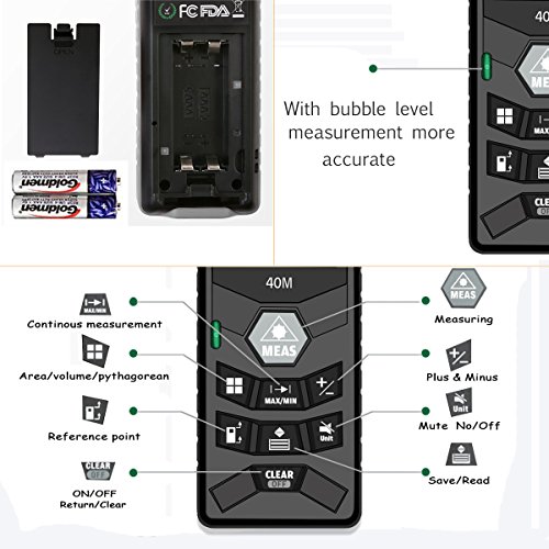 - →HIGHT ACCURACY: accurate to ± 0.005 feet laser precision technology, horizontal bubble is more convenient to adjust the measurement angle, the measurement range extended to 131Ft.