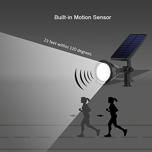 3rd Generation with Built-in Motion Sensor: Distinguished from most solar spotlight on the market with great PIR sensor which detects people up to 23 feet within 120 degrees. The spotlight is light sensitive and won't light up in bright place.