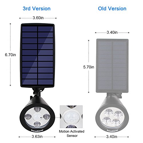 Description Compared with the old versions, the InnoGear 3rd generation solar spotlight comes with upgraded motion sensor activated detector and more working modes. Great PIR Sensor detects people up to 23 feet within angle of 120 degrees! It would be a better solution for illuminating your landscape, flag, tree, garden, yard, pathway, walkway etc.
