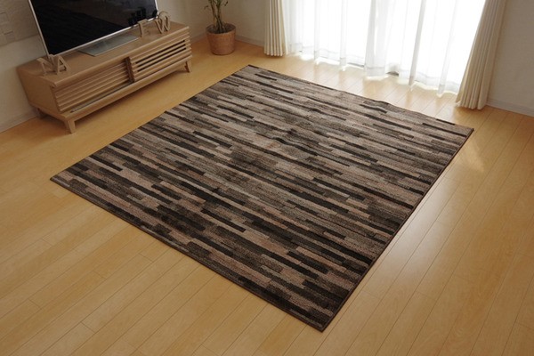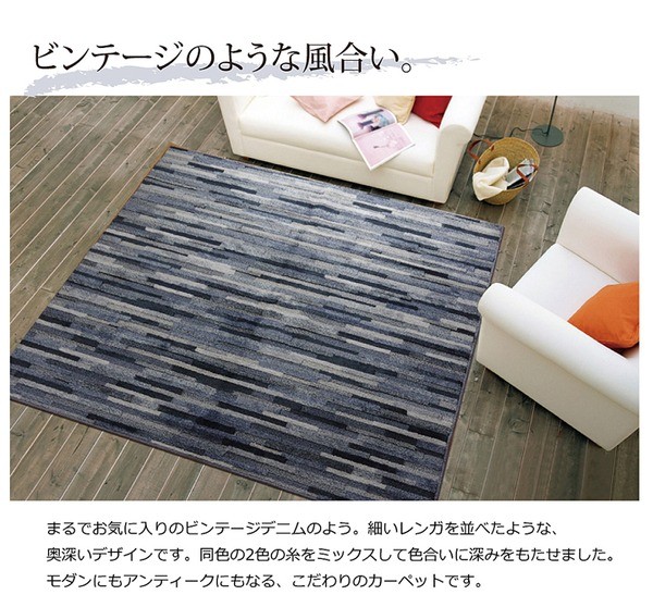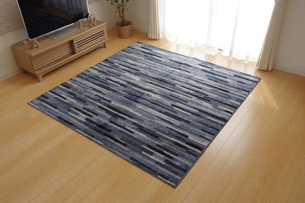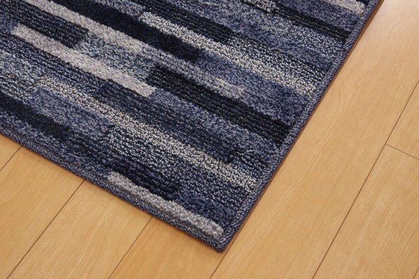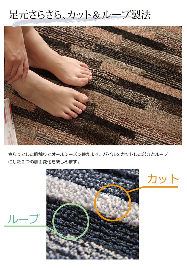 安心の日本製タフトラグです。基布には抗菌・防臭・防ダニ加工を施しておりますので、お子様にも安心です。パイル部分には耐久性に優れたポリプロピレン糸を使用しています。また、ポリプロピレンには摩擦に強く、遊び毛がでにくいという特長もあります。ポリプロピレンの中でもソフトPPという素材を使用していますので、硬いイメージのあるポリプロピレンでですが、柔らかい肌触りに仕上がっております。ハイカット、ローループという技法を使用しています。パイルの長い部分はカットパイル、短い部分はループパイルにすることで表面に凹凸をつくり、柄に立体感を出しました。さらっとした肌触りで季節を選ばず、オールシーズンご使用頂けます。ホットカーペット、床暖房にも対応しています。
