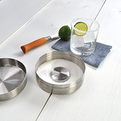 Easily rim cocktail glasses with spicy Chile salt, vanilla-infused sugar and more with this two-piece cocktail rimmer. Perfect for margaritas or sidecars, cocktail rimmer is constructed from durable brushed stainless steel and features separate sides for wet and dry ingredients. A stylish and functional addition to any bar.