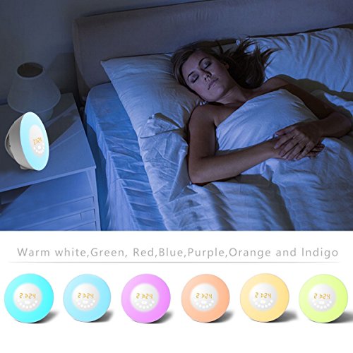 Sunset/Sunrise Simulation Wake Up Light 30 mins before alarm/sunset time, the sunrise/sunset simulation white light will be bright/dark gradually. At the alarm time, the alarm sound will plays for 2 minutes, Press button?"SNOOZE"?enter the snooze mode, the wake up sound will play again after 5 minutes and last 2 minutes. Amazing color change clock with different color change, when put in dark area, the effect is more attractive