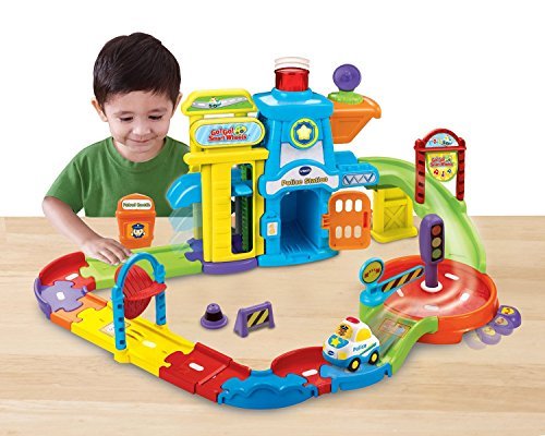 -. Binding : Toy -. Brand : VTech -. EAN : 0719040148213 -. Feature : Police station playset combines learning and pretend play; enhance your child's creativity through playtime with Go! Go! Smart educational toys / Features alarm button, spinning track disc bars and an elevator to move the car to the top of the police station toy; volume control and auto-shut off are included / Includes a police car toy that teaches the letter "P" through pretend play; police car requires 2 AAA batteries (batteries included for demo purposes only; new batteries recommended for regular use) / Features VTech SmartPoint technology; 6 SmartPoint location that interacts with SmartPoint vehicles to trigger fun phrases, music and sound effects / VTech Go! Go! Smart Wheels and Animals race car track pieces can all be connected for max play; a great early learning center for children ages 1 to 5 -. Label : VTech -. Manufacturer : VTech -. ProductGroup : Toy -. ProductTypeName : TOYS_AND_GAMES -. Publisher : VTech -. Studio : VTech -. Title : Police Station Playset with Trigger Fun Phrases, Music & Sound Effects -. UPC : 719040148213