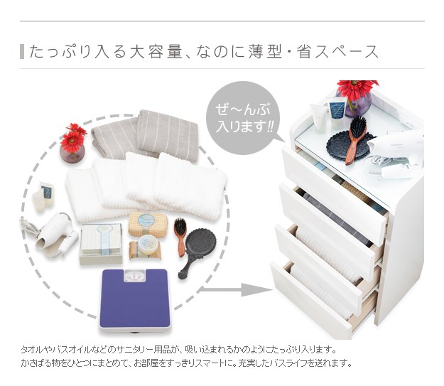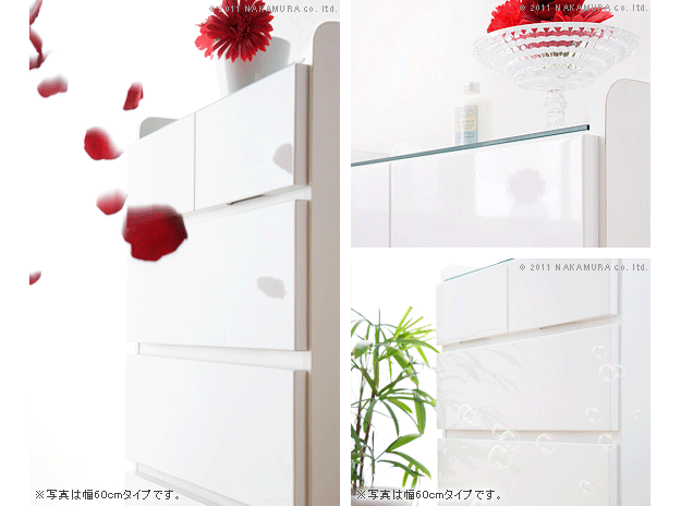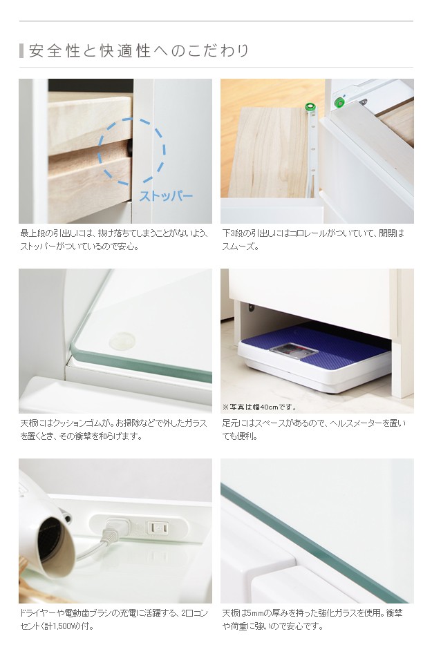 商品について:美しい光沢のある鏡面仕上げ。天板はガラストップでキズに強く、本体も水や汚れに強いメラミン仕上げ。便利な2口コンセント(計1,500W)付。引出しの最上段はストッパー、下3段はコロレール付。