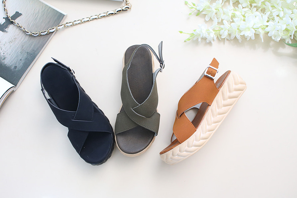 넓은 크로스 스트랩으로 발등을 감싸주는 안정적인 통굽샌들입니다