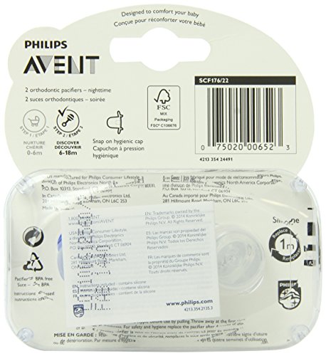 -. Binding : Baby Product -. Brand : Philips AVENT -. Color : Multicolor -. Feature : Orthodontic symmetrical collapsible nipple so right side up or upside down, philips avent pacifiers help ensure natural development of teeth and gums / Taste and odor-free silicone nipple makes for an easy transition between pacifier, breast and bottle / Ideal age range: 6-18 months / WARNING: Do not tie pacifier around child's neck as it presents a strangulation danger / Colors and designs may vary -. Label : Avent -. Manufacturer : Avent -. ProductGroup : Baby Product -. ProductTypeName : BABY_PRODUCT -. Publisher : Avent -. Studio : Avent -. Title : Philips AVENT BPA Free Night Time Pacifier