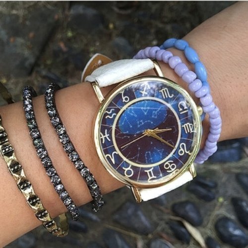 별자리가 문자판에 아름답고 곁들여졌 대인기 아날로그 표시 손목시계입니다.