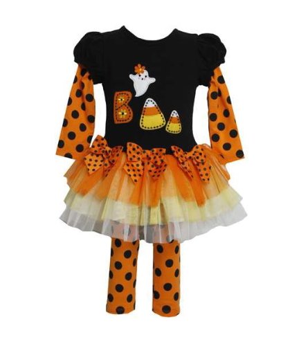 -. Feature : Up for your consideration is this adorable dress outfit set from Bonnie Jean. The dress features black knit top with sewn in orange dotted sleeves, ghost / BOO candy corn applique at center, triple orange dotted grosgrain bows at drop waist, and mixed 'candy corn' color mesh skirt. Comes with a coordinating orange dotted leggings. A fun and stylish little dress outfit for your little one to wear during the Fall season. Dress and leggings are 95% cotton & 5% spandex. Bonnie Jean is a great brand sold in high end department stores.
