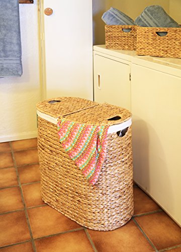 - Feature : Dimensions: 22.75" x 13" x 24" H / Includes 2 removable and washable canvas laundry bags with cut-in handles / 2 separate laundry compartments / Tightly hand-woven water hyacinth / Ideal for use in your bedroom, closet or laundry room