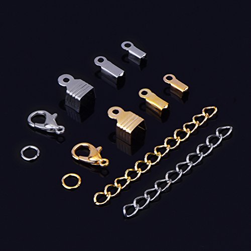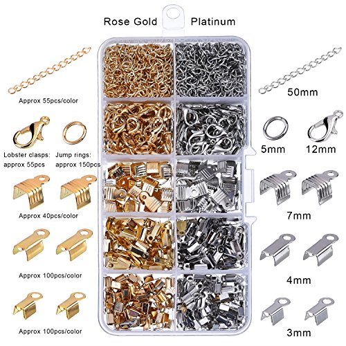 - Jewelry findings kit: includes iron fold over cord ends, lobster claw clasps, jump rings and extension chains, 1000 pieces in total; Made of metal, 2 different colors, rose gold and platinum