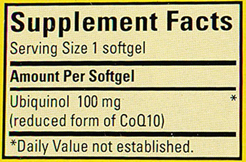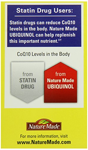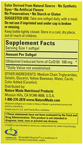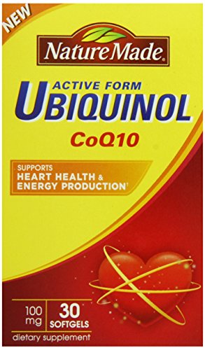 -. Binding : Health and Beauty -. Brand : Nature Made -. EAN : 0882862310905 -. Feature : Supports heart health and energy production / Powerful antioxidant / No.1 pharmacist recommended brand of CoQ10 supplements -. IsAdultProduct : 0 -. Label : Nature Made -. LegalDisclaimer : IN NO EVENT, REGARDLESS OF CAUSE, SHALL ALL STAR SALES BE LIABLE FOR ANY INDIRECT, SPECIAL, INCIDENTAL, PUNITIVE OR CONSEQUENTIAL DAMAGES OF ANY KIND, WHETHER ARISING UNDER BREACH OF CONTRACT, TORT (INCLUDING NEGLIGENCE), STRICT LIABILITY OR OTHERWISE, AND WHETHER BASED ON THIS AGREEMENT OR OTHERWISE, EVEN IF ADVISED OF THE POSSIBILITY OF SUCH DAMAGES. -. Manufacturer : Nature Made -. MPN : 540970 -. NumberOfItems : 1 -. PackageQuantity : 1 -. PartNumber : 540970 -. ProductGroup : Health and Beauty -. ProductTypeName : HEALTH_PERSONAL_CARE -. PublicationDate : 2012-07-27 -. Publisher : Nature Made -. Size : 30 -. Studio : Nature Made -. Title : Nature Made Ubiquinol CoQ10 100 Mg Softgel, 30 Count -. UPC : 882862310905