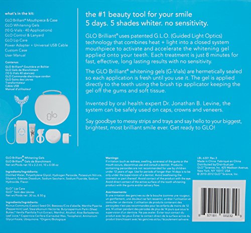No more messy strips. No more uncomfortable trays. No more runny gels. Fast, fun, and easy to use - this kit comes with everything you need to get pain-free, long lasting, professional teeth whitening results in the comfort of your own home. Your teeth get whiter with each 8-minute application. The wearable hands-free design lets you multi-task while you whiten, shutting off automatically when each application is complete. Get the freedom to whiten any time you want and share your smile more! Invented by world renowned oral health expert and New York City celebrity dentist, Dr. Jonathan B. Levine, the patented GLO Brilliant Teeth Whitening Device is the only one of its kind. The GLO device combines the accelerating power of GLO warming heat and light with specially formulated hydrogen peroxide whitening gel to deliver painless teeth whitening results in short, pre-timed, 8 minute applications. GLO is clinically proven, FDA registered, and is the brand trusted by thousands of dental practices for use with their own patients.