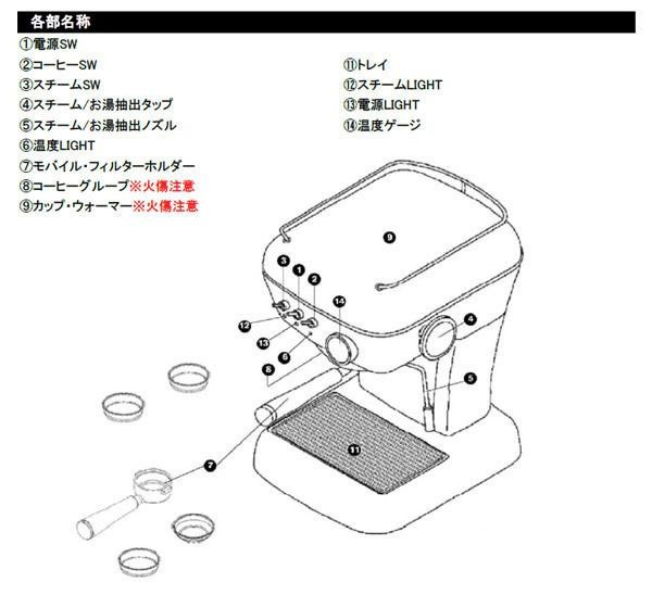 | 付属品 | ポルタフィルタハンドル(2スパウト)、スーパークリームフィルターバスケット(1カップ用、2カップ用、ポッド用)、筒型スチームチップ、1つ穴スチームチップ、アルミ製タンパー、メジャースプーン、スケール除去用粉末洗剤、取扱説明書、保証書(1年) |