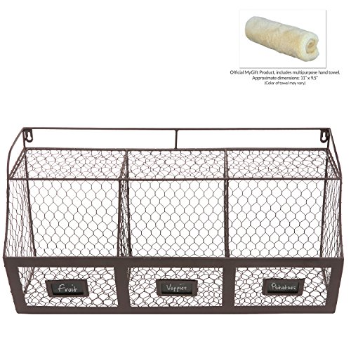 Keep your kitchen organized and your fruits and vegetables safely stored with this metal storage rack. The woven chicken wire design and rustic brown finish on this metal rack give it a touch of country-style charm, while the 3 storage bins and the sturdy top shelf provide you with plenty of space to store and organize your favorite fruits, vegetables, snacks, and other household items. You can also keep track of what contents go in which compartment by using the erasable chalkboard labels on the front of each of this storage bin's 3 compartments. Ready to bring rustic-yet-chic style and convenient storage to your kitchen? This metal food storage bin is the perfect choice.
