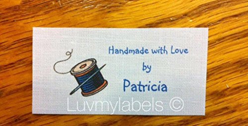 -. Title : 40 Custom Sew in Flat sewing Labels with Blue Thread Graphic-made in USA