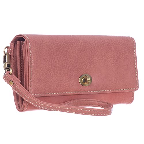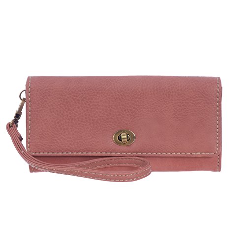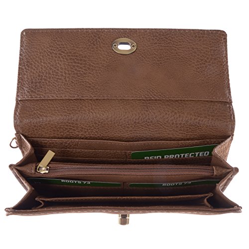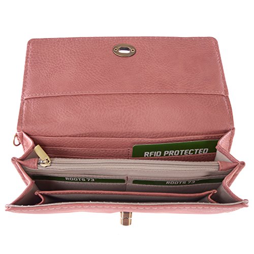 Product Description Sleek and organized this Roots 73 Ladies Clutch and Wristlet is a high performance wallet. Featuring multi functional pockets, a removable wristlet strap, a classic turn-lock closure and RFID protection take this fantastic style from day to evening. Available in Sand, Dusty Rose, and Trench Brown. 0
