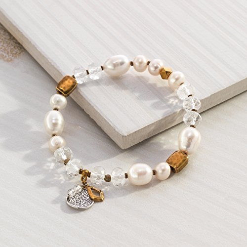 Classic elegance with a casual spin, the Down to Earth Stretch Bracelet everyday staple showcases rotating stations of white rock crystal, golden-white pearls, and yellow brass, finished with two sterling silver and brass charms. Bracelet measures 7 by 5/8 inches (unstretched), with an easy slip-on design. Piece comes with a ".925" sterling silver stamp as a symbol of guaranteed product quality.