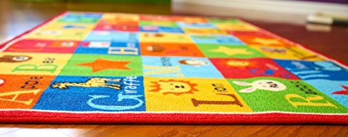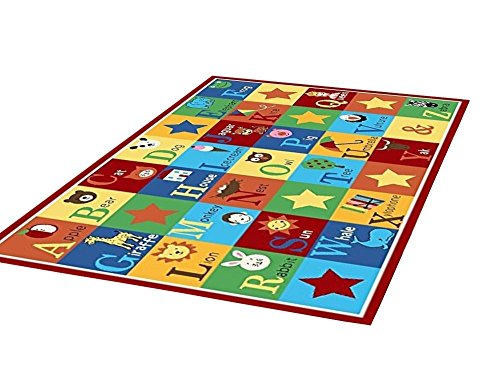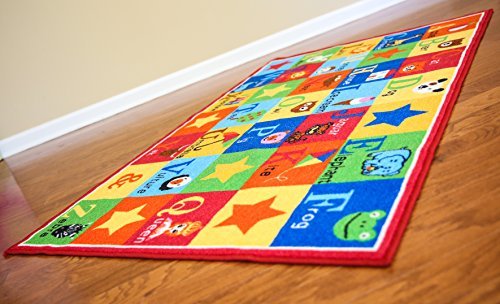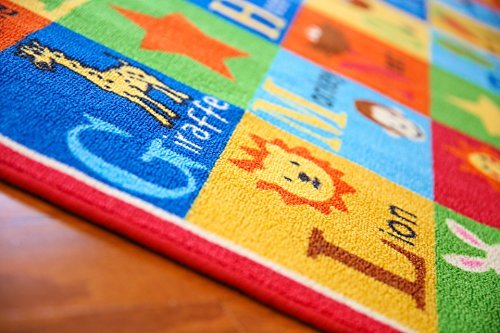 Kids rug ABC animals children area rug anti skid actual size. Anti slip backing for safety of kids. Non-skid rubber bottom, machine washable, power loomed construction with nylon.