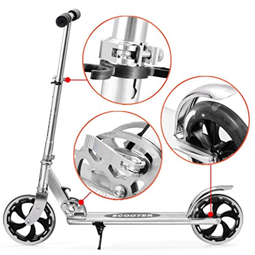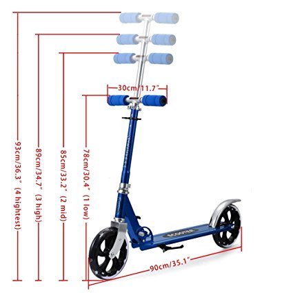 -. Feature : Main Material: Aluminum Alloy / Soft grips, sponge and folding handlebar, give you a comfortable feeling. / Adjustable height, 4 level height adjust, range 78-93 cm / 30.4-36.3 inch. / Comfortable riding, the urban street scooter with extra-large 8""(200mm) urethane wheels and soft hand grips greatly reduces vibrations in plain/bumpy/rough road so you don't have to worry about cracks on the pavement. / US Stock-No assembly request, easy to fold and carry with its patented10-Seconds Easy-Folding system, suit for city urban scooter's quick storage and transportation.