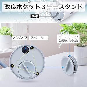 シールリングをつけ、スペーサーをつけ、それによって、水は電池ボックスを浸入できなくなります。それに、スペーサーは滑り止められ、滑らかなガラスやタイルなどで滑りにくく、ケーブルを使わず、どこでも安 心して置けます。