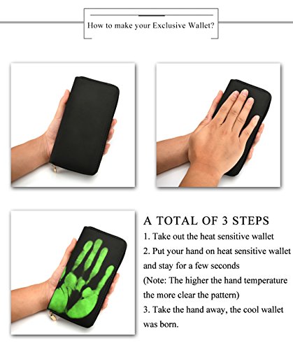 -. Feature : Product Dimensions: 7.61 x 3.51 x 0.98 inches / Made of heat sensor leather ,Temperature contact will be sensitive to color change. / Characteristic: 2017 New design, simple but special with Thermal Sensor, color changed by temperature. Onece your hand touch the purse, it will change color (green/orange/rose/yellow). / Capacity: 8 credit card slots, 1 zipper coin pocket, 2 side bill pockets, 3 full length compartment in the middle (suit for your cell phone, passport and some cash). / All have temperature of the items can be P.R.Inted out pattern, such as: hand, hot water, sunshine etc. The higher the hand temperature the more clear the pattern. When the temperature is dispersed, the pattern will slowly disappear, if you want to quickly remove the pattern, you can use a little cold water to wipe. Are you want to have this magical purse? More exciting patterns waiting for you to create.