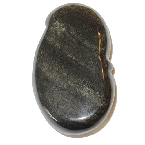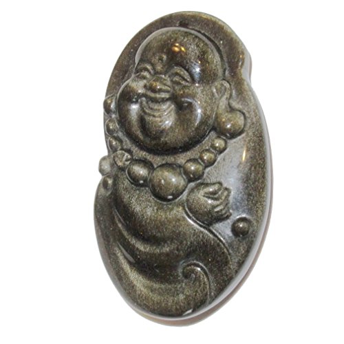 This crystal amulet is carved from volcanic obsidian gemstone that has natural gold sheen. While black in normal setting, you will see the golden glitter at certain angles of light. It is in the form of a sacred laughing buddha, who represents abundance and happiness. The buddha wears a mala necklace and glowing smile. The amulet has a hole near the top, so it can be strung into a charm or pendant. Receive one unique gem per order from a hand select Satin Crystals collection.