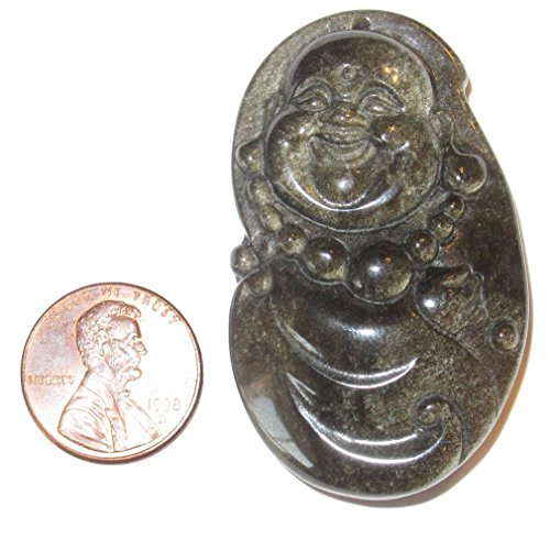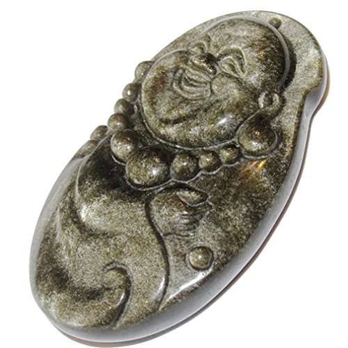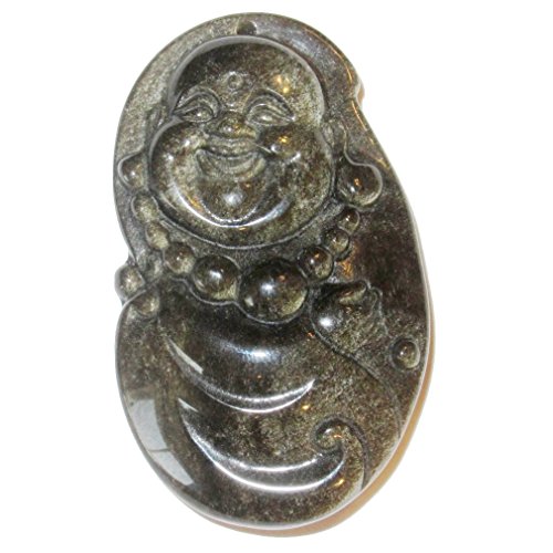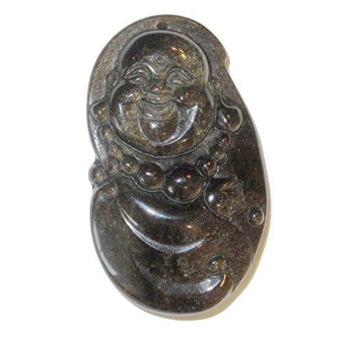 Obsidian Amulet Gold 01 Stunning Laughing Buddha Black Sheen Pendant Charm Crystal 2" (Gift Box)