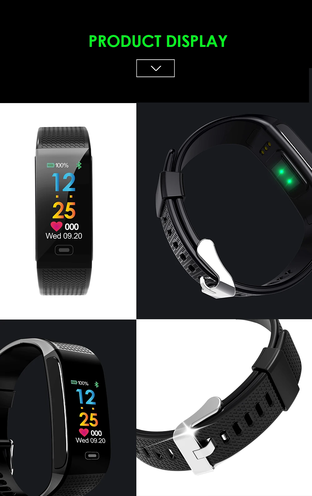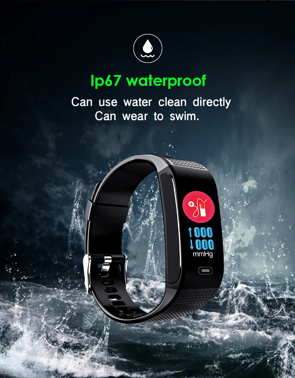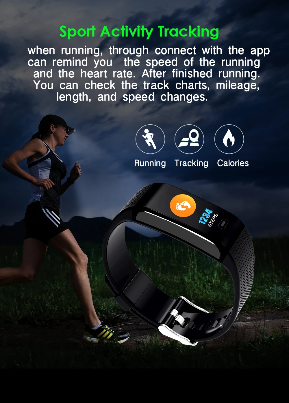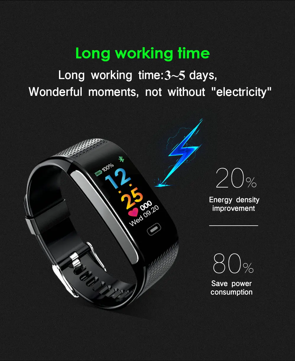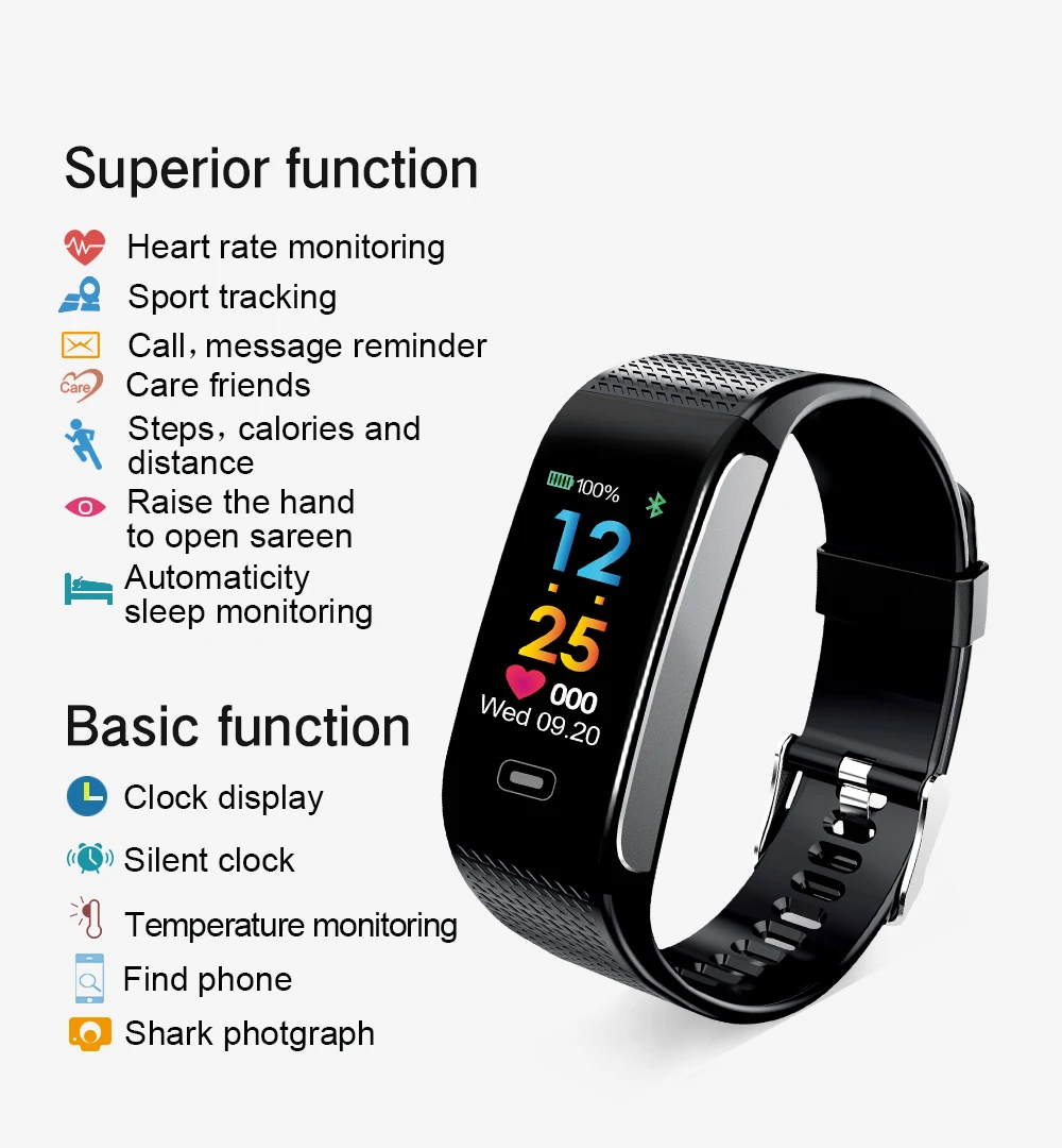 Function:Message Reminder,Passometer,Alarm Clock,Fitness Tracker,Blood Pressure,Call Reminder,Remote Control,Sleep Tracker,Heart Rate Tracker,Social Media Notifications