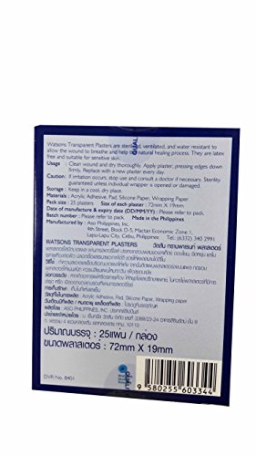 -. Feature : 3 packs of Watsons Transparent Plasters. Latex free, Repels water, Breathable, Sterile. (Size of each plaster: 72mm x 19mm.) (25 plasters/ pack). Materials: Acrylic Adhesive, Pad, Silicone Paper, Wrapping Paper. / Watsons Transparent Plaster are sterilised, ventilated, and water resistant to allow the wound to breathe and help the natural healing process. They are latex free and suitable for sensitive skin. / Usage: Clean wound and dry thoroughly. Apply plaster, pressing edges down firmly. Replace with a new plaster every day. / Caution: If irritation occurs, stop use consult a doctor if necessary. Sterility guaranteed unless individual wrapper is opened or damaged. Storage: Keep in a cool, dry place. / free!! Tracking number and sticker Thai_product, souvenir from Thai_product., High Quality & Services by Thai_product.