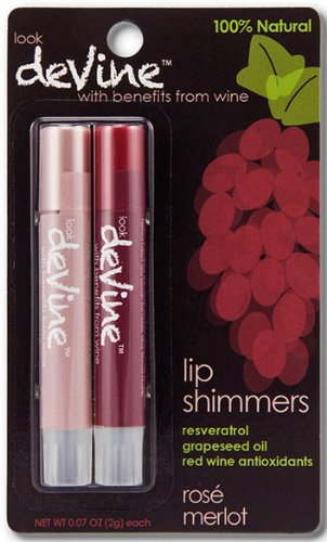-. Binding : Misc. -. Brand : DeVine -. EAN : 0856584001229 -. Feature : •All Natural, Alcohol Free, Gluten Free, Cruelty Free, Pesticide Free, Paraben Free / •Contains Resveratrol, a powerful antioxidant containing phytoalexin (antimicrobial substance) found in the skin of red grapes / •Grape Seed Oil, another anti-oxidant and rich in phenols. It's a wonderful moisturizer containing a high content of Linoleic Acid, a fatty acid essential for cell membranes and skin health / •And Red Wine Antioxidants or Polyphenols, known to fight free radicals and help prevent cell damage / •Anti Aging, Moisturizing, and Made in the USA -. IsAdultProduct : 0 -. Label : deVine -. Manufacturer : deVine -. PackageQuantity : 2 -. ProductGroup : Beauty -. ProductTypeName : BEAUTY -. Publisher : deVine -. Studio : deVine -. Title : deVine Lip Shimmers Rosé & Merlot 2 Pack -. UPC : 856584001229