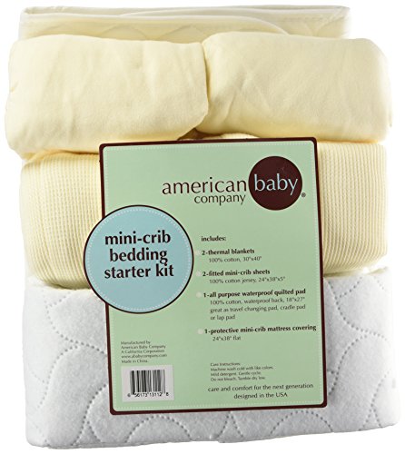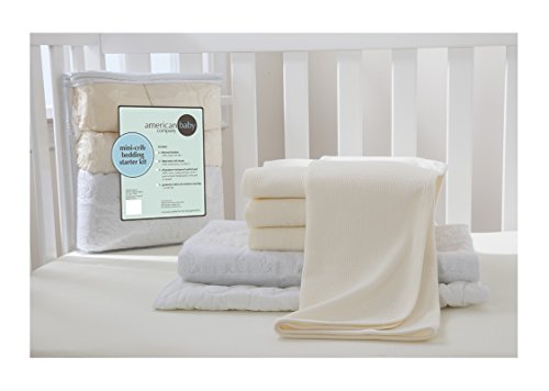 Starter set includes (2) 100% cotton thermal blankets, (2) Crib fitted 100% cotton jersey knit sheets, (1) flat quilted pad and (1) flat protective mattress cover