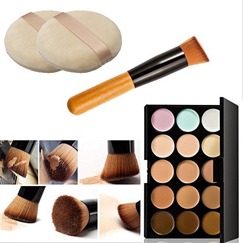 Feature : Cream concealers that offer terrific coverage on the dark circles, facial wrinkles and other facial defects and give you a new look. / High quality nylon material makes this brush comfortable and soft to use / The powder puff attacks the elasticity appropriately / Make-up Puff Diameter: 3.15" / 8cm / Package Includes: 1 x 15 Colors Concealer Palette; 1 x Oblique Head Contour Makeup Brush; 1 x 2 Pcs Powder Puff Soft Sponge
