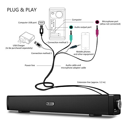 【Universale Kompatibilitat】Dank der Dual 3,5 mm Audio-Buchse kann dieser Lautsprecher mit Mikrofon, Headset, PC, Computer, Notebook, Tablet, Smartphone, MP3, MP4, Walkman, CD Player, Radio und Fernseher/TV mit 3,5mm Audio Adapter verbunden werden.
