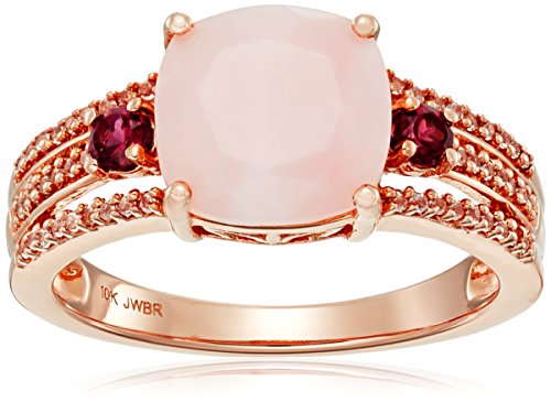 -. Title : 10k Rose Gold Natural Pink Opal Cushion Cut with Round Shape Rhodolite Garnet and Created White Sapphire Ring