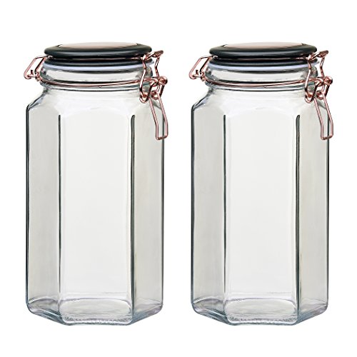 Amici Home, 7CN139S2R, Adler Collection Hermetic Preserving Glass Canister, Hexagonal Faceted Body, Black and Copper Lid, Food Safe, 52 Ounces (Large) Set of 2