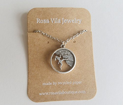 This versatile nature necklace was delicately made- Our mountain necklace features a silhouette of a woman climbing a mountain within a round framed pendant. The cut-out portion mimics the sky and takes on the color of your skin or shirt. It hangs on a 17" necklace chain with a secure lobster clasp closure. This rock climber jewelry piece comes available in silver or gold tone. It'll match with anything in your wardrobe and works for any occasion from rock climbing to a family get together.