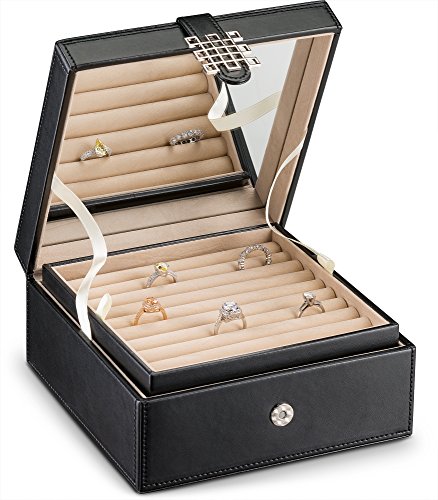 Glenor Co Ring Organizer Box - 108 Slot Classic Jewelry Display Holder - 2 Storage Trays with Modern Buckle Closure, Large Mirror - Holds Rings and Cufflinks - PU Leather Case - Black