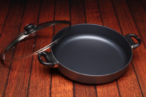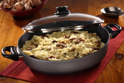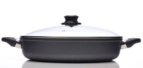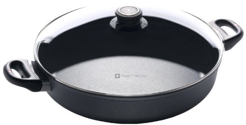 -. Feature : Model #6632c: 32 cm (12.5") / Patented nonstick coating reinforced with real diamond crystals (PFOA-free) / Made in Switzerland; Cast aluminum; Oven-safe up to 500 degrees F / Stay-cool ergonomic handle provides a safe, comfortable grip / See-through tempered glass lid with knob that doubles as a steam vent
