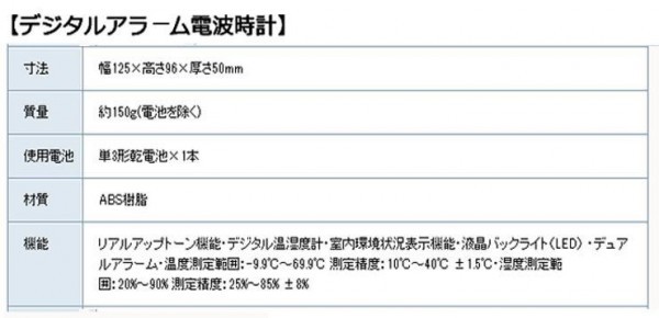 | 付属品 | 取扱説明書、保証書(保証期間:1年間)、単3形アルカリ乾電池×1、壁掛用木ねじ×1本 |